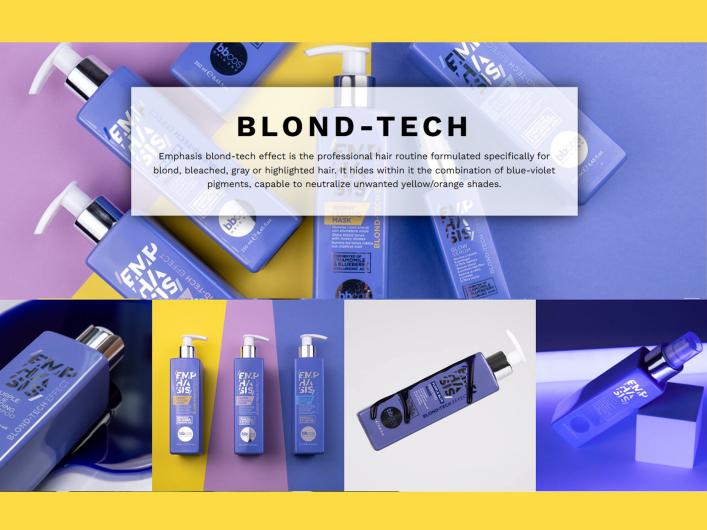 Emphasis blond-tech effect is the professional hair routine formulated specifically for blond, bleached, gray or highlighted hair. It hides within it the combination of blue-violet pigments, capable to neutralize unwanted yellow/orange shades.