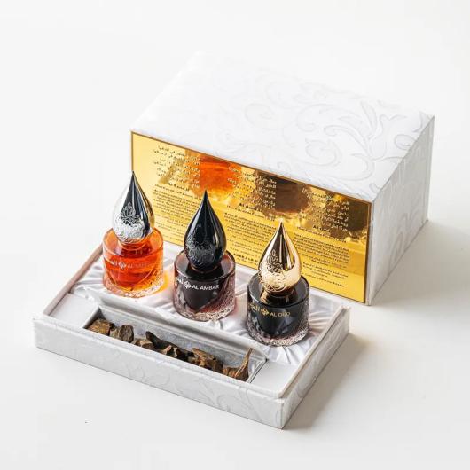 Immerse yourself in the richness of Arabian perfumery with this extraordinary collection, featuring three masterfully crafted fragrances: Oud, Amber, and Sandalwood. Each scent embodies the essence of luxury and tradition, bringing together the finest natural ingredients for an unparalleled olfactory experience.