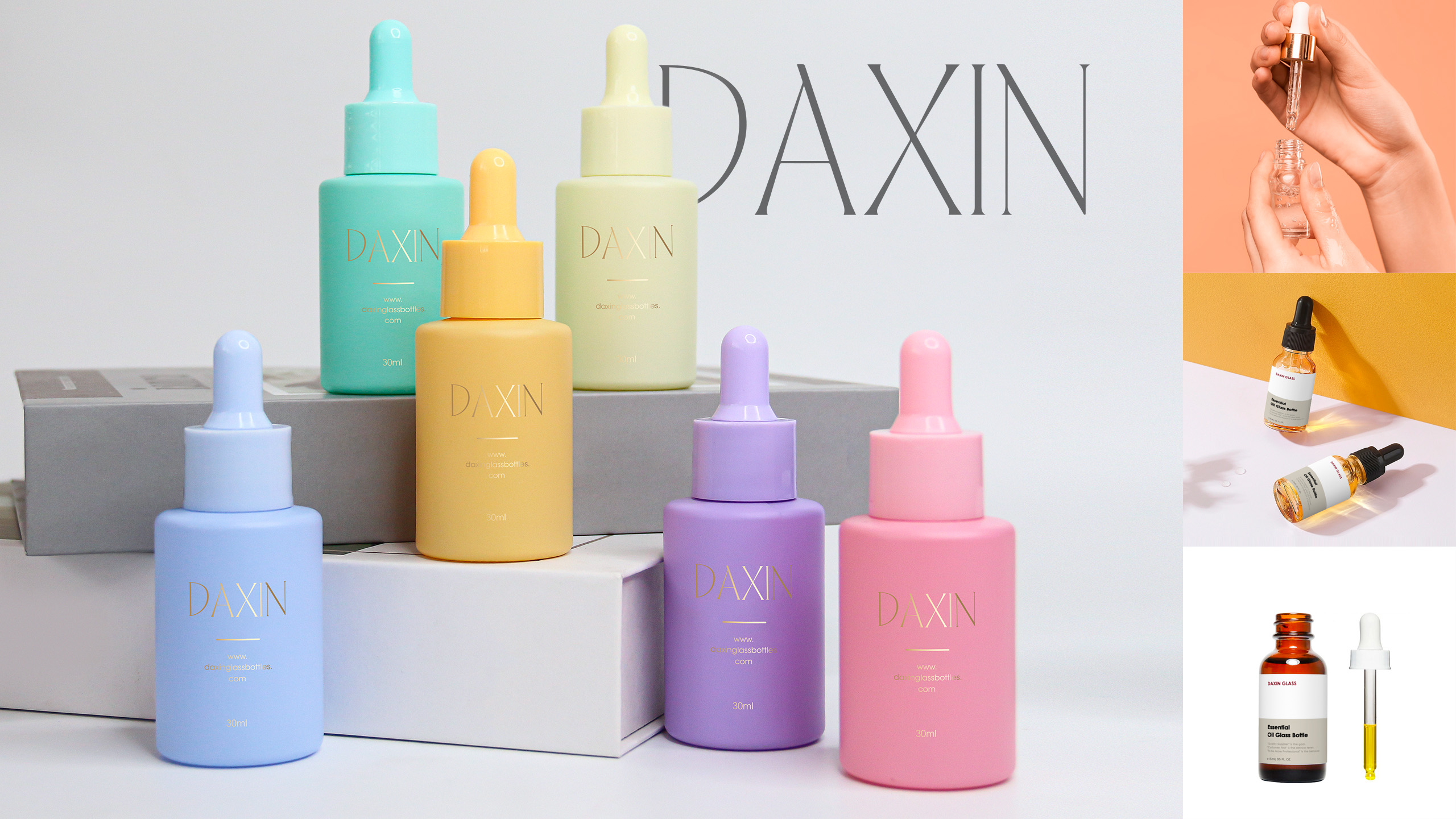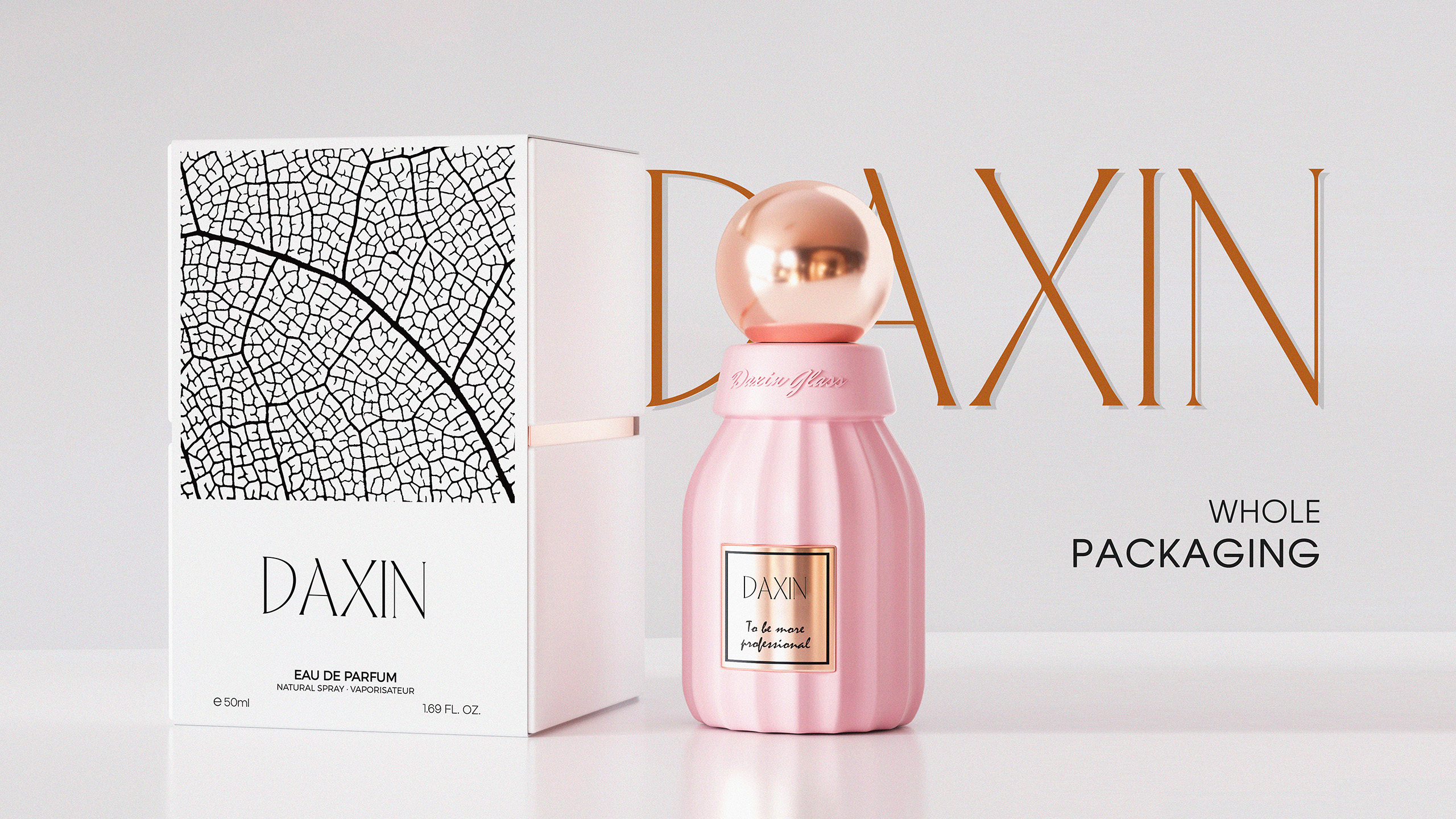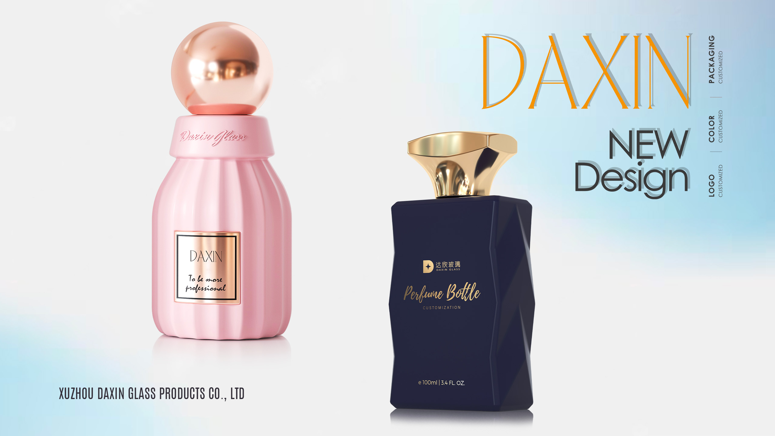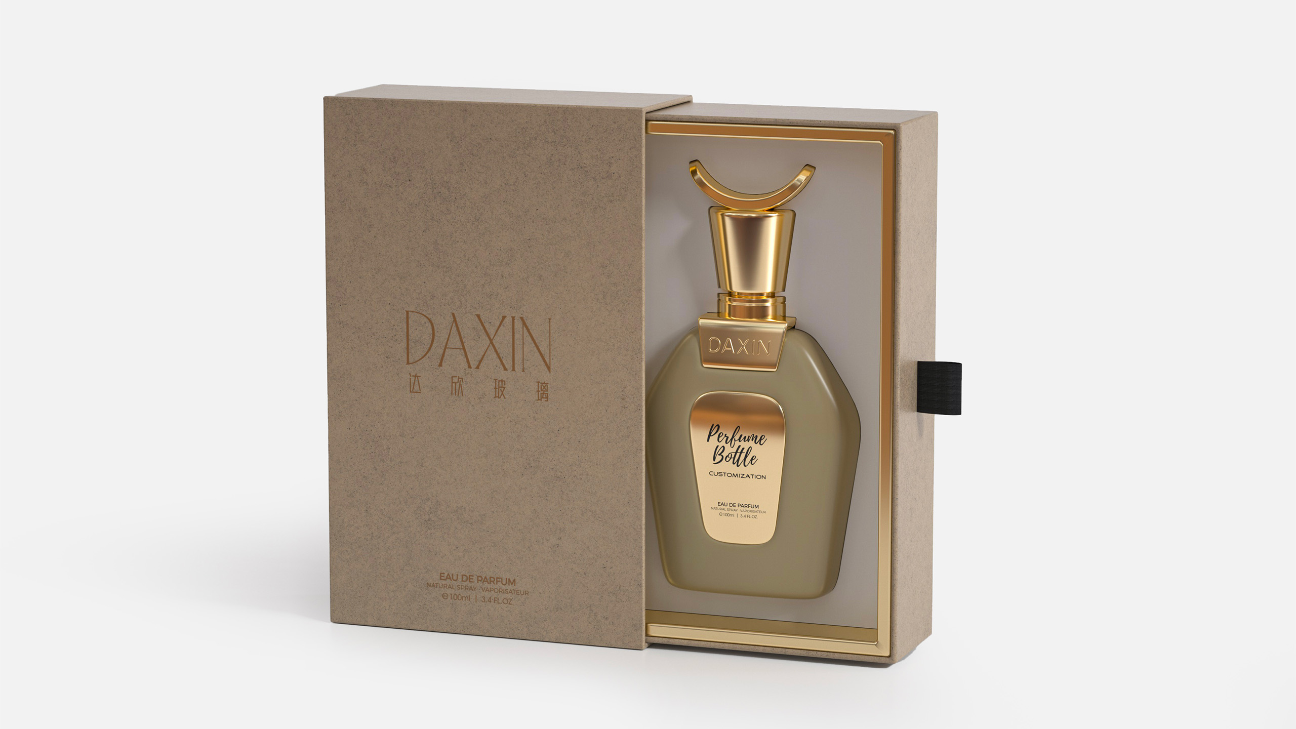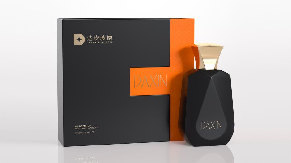 The DAXIN perfume bottle, presented by DAXIN Glass, showcases a modern and sophisticated design. The bottle is black with a sleek, angular shape, complemented by a gold-colored cap that adds a touch of luxury.